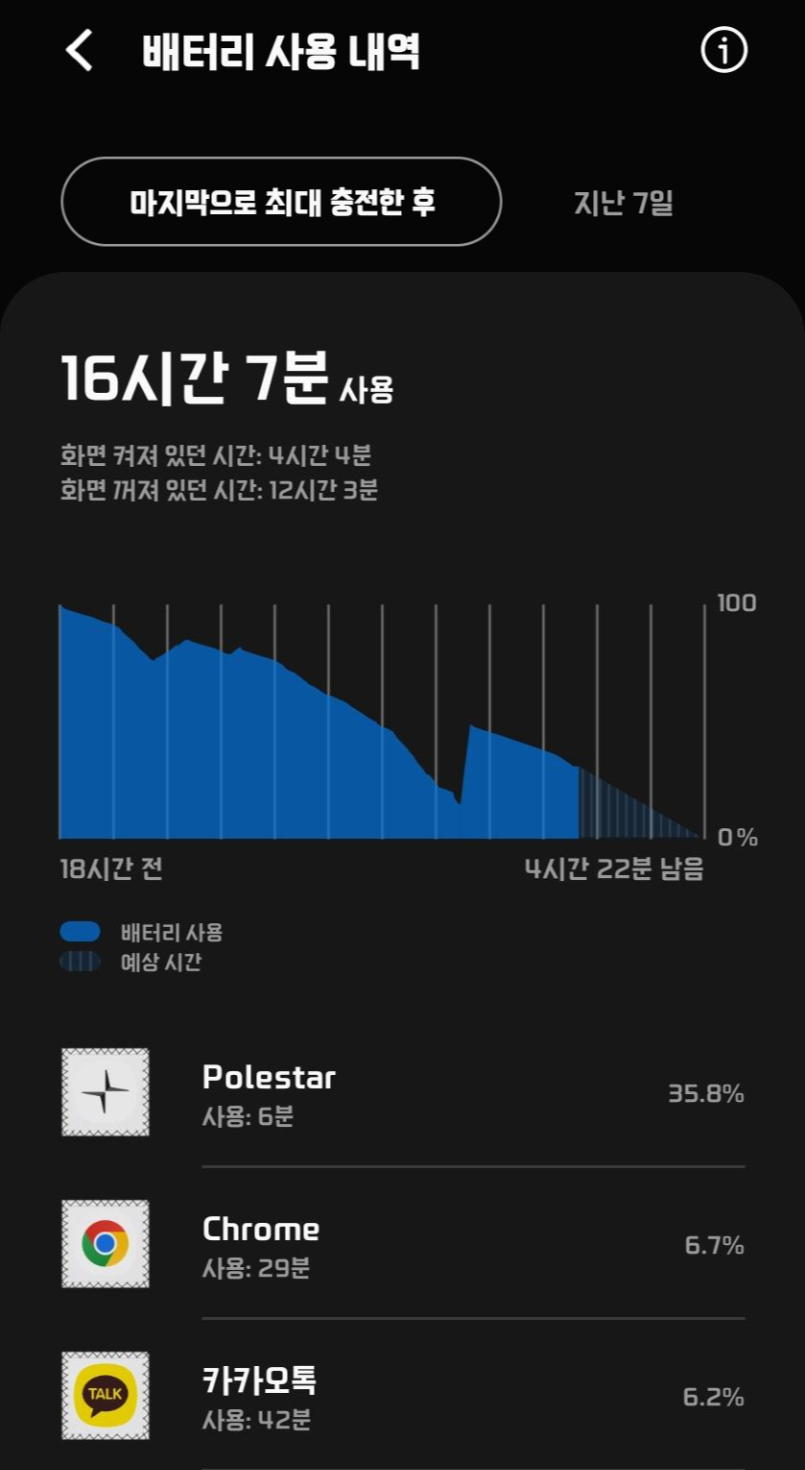 Digital Key용 폴스타 앱의 초기 사용 당시, 핸드폰의 백그라운드에서 배터리 소모가 심해 앱의 권한을 수정하여 사용했습니다. (반쪽짜리) 최근 4/22 업데이트 후 모든 권한을 허용하고 최대 기능으로 사용했는데, 배터리 소모량이 대폭 개선된 것과 관련한 포스팅입니다. 폴스타2 Handover (인도) 후기 마침내, 그리고 힘들게, 하지만 기쁘게 인도받았습니다. [폴스타 하남 폴스타2 인도 후기] '너무 느긋'한 우리 가족의 안 좋은 버릇 탓에, 토요일 오전 11시로 예정되어 있던 인도식에 이미 늦은 useful-useless.tistory.com 위 포스팅에서 폴스타의 Digital Key용 App의 배터리 사용량이 과다하다는 것을 언급했습니다. 당시에 아래와 같은 어마 무시한 배터리 사용량을 보..